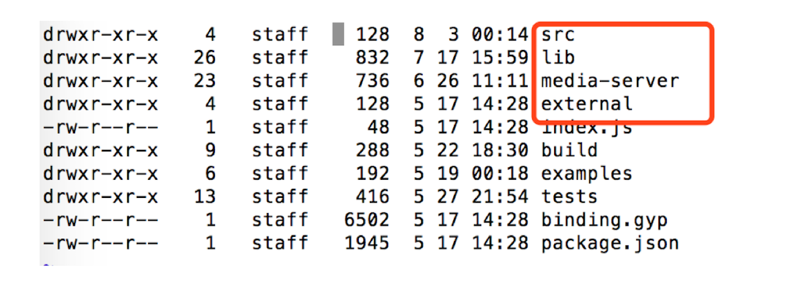 实际上,在构建 Media-server-node 项目时,重点是对上面三个 C/C++ 目录(即 external、media-server、src)中的 Native 代码的构建。项目构建时会调用 node-gyp 命令将三个目录中的 C++ 代码编译成 Node.js 的 Native 插件,以供 JavaScript 脚本使用。