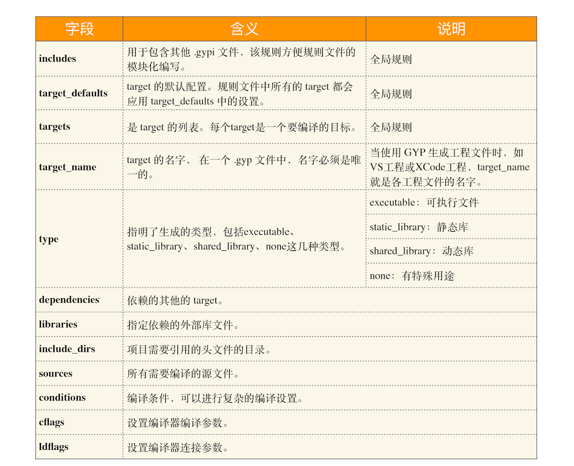 GYP中除了variables外,还定义了其他几个全局规则,具体的内容可以查看文末的参考一节,这里就不一一列出了。