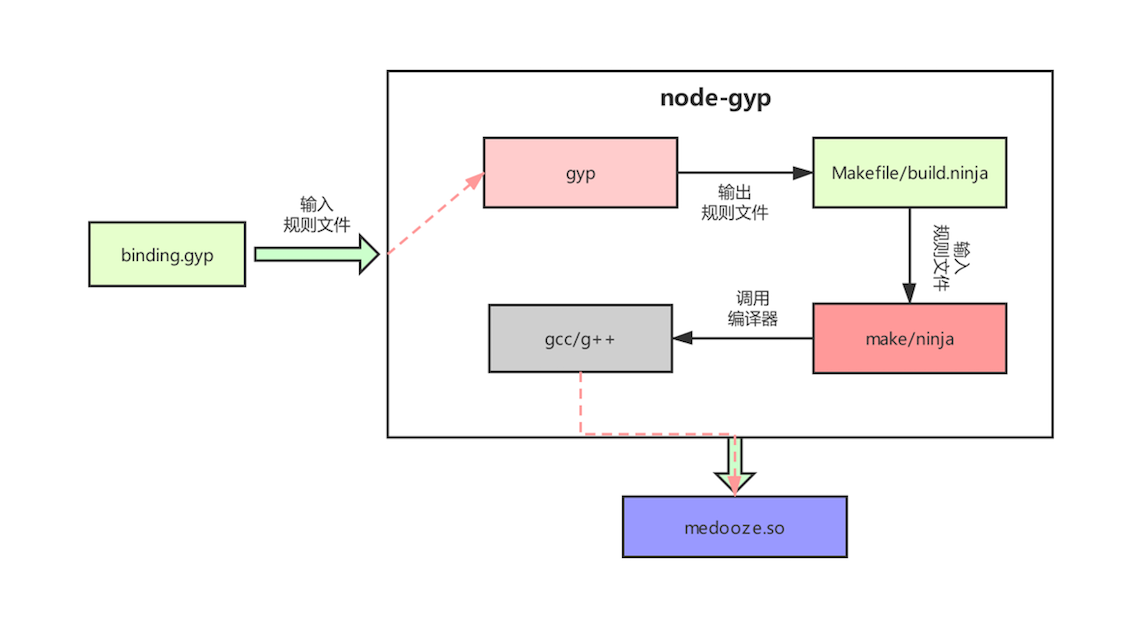 实际上,你可以简单地将 node-gyp 认为是 gyp 和 Make/Ninja 工具的集合,当构建某个项目时,在底层node-gyp先使用 gyp 工具根据 binding.gyp 中的规则生成Makefile或 build.ninja文件,然后再调用 Make/Ninja 命令进行构建,编译出 Native 插件。