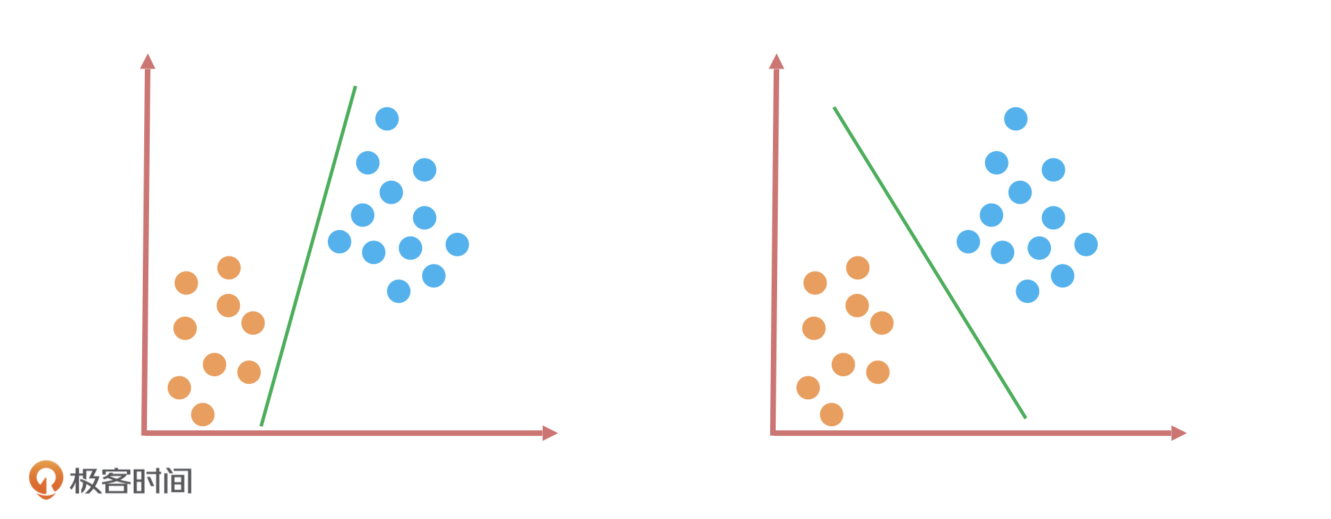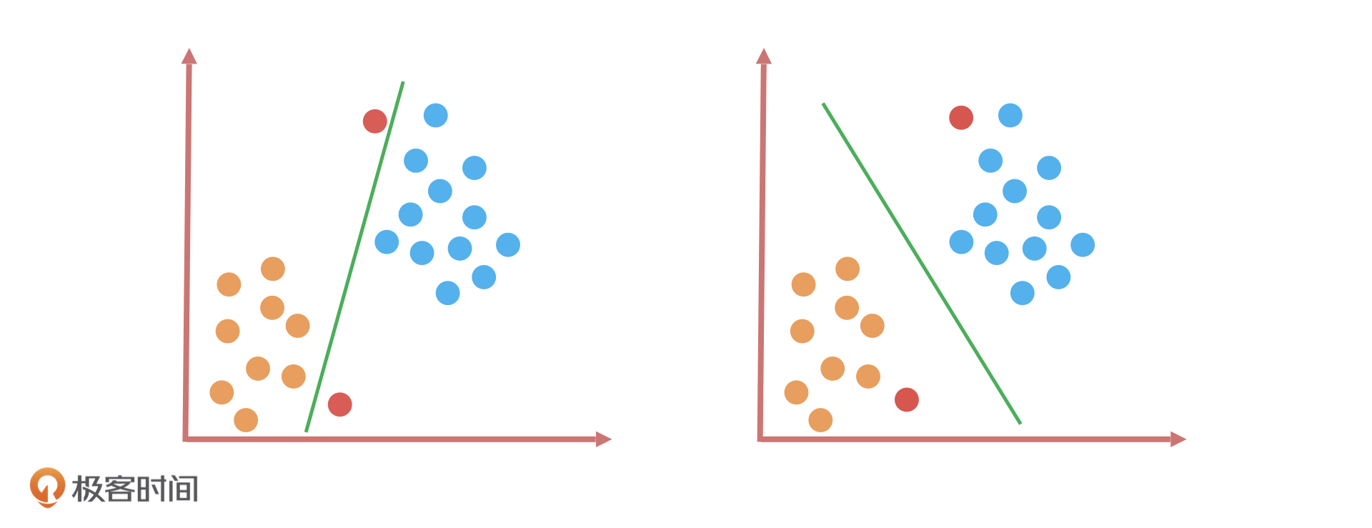 那为什么一定要找到间隔最大的这条直线呢?它除了能让分类样本的区分度最高,还有一个好处,就是当新数据发生波动的时候,就算超过了原有数据样本点的最近边界,分类结果仍然不会受到影响。因此,寻找最大间隔的过程也是 SVM 算法最优化参数的过程。