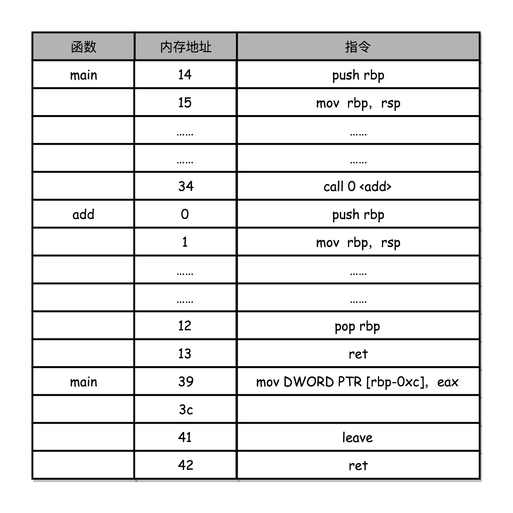 而在函数add执行完成之后,又会分别调用第12行的pop rbp来将当前的栈顶出栈,这部分操作维护好了我们整个栈帧。然后,我们可以调用第13行的ret指令,这时候同时要把call调用的时候压入的PC寄存器里的下一条指令出栈,更新到PC寄存器中,将程序的控制权返回到出栈后的栈顶。