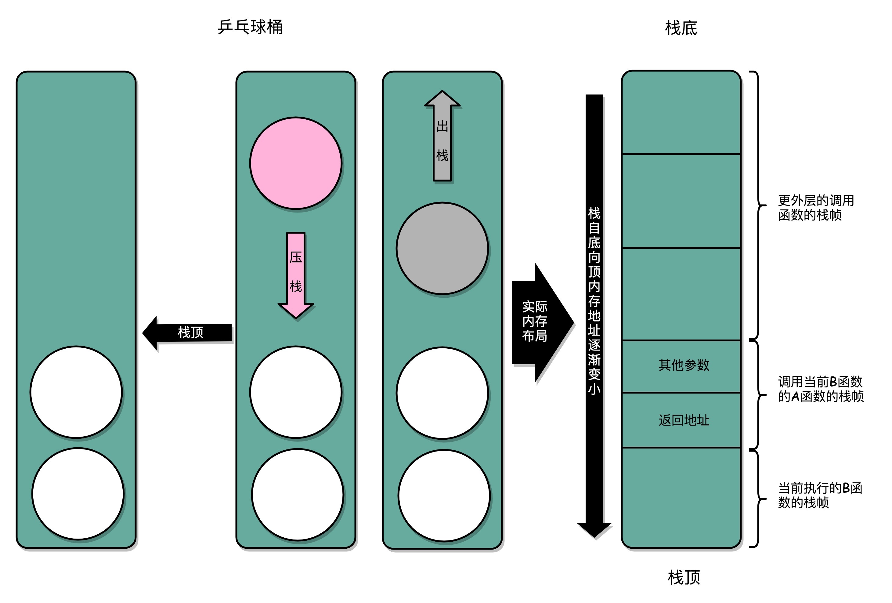 最终,计算机科学家们想到了一个比单独记录跳转回来的地址更完善的办法。我们在内存里面开辟一段空间,用栈这个后进先出(LIFO,Last In First Out)的数据结构。栈就像一个乒乓球桶,每次程序调用函数之前,我们都把调用返回后的地址写在一个乒乓球上,然后塞进这个球桶。这个操作其实就是我们常说的压栈。如果函数执行完了,我们就从球桶里取出最上面的那个乒乓球,很显然,这就是出栈。