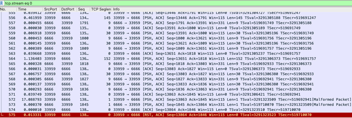 我们选中575号报文,然后Follow -> TCP Stream,得到了这个RST所在的TCP流的全部报文: