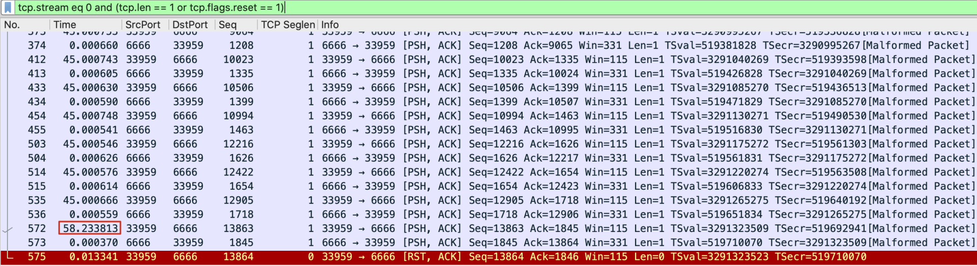 1 | tcp.stream eq 0 and (tcp.len == 1 or tcp.flags.reset == 1) |