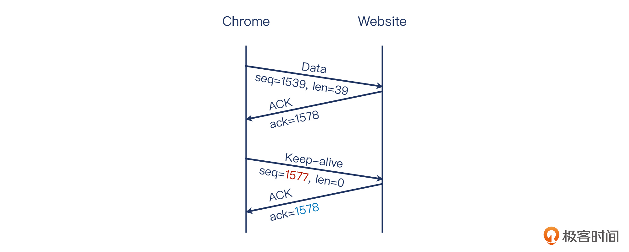 其实,如果不做显式的配置,默认创建出来的TCP Socket是不启用Keep-alive的,也就是都不会发送心跳包。不过,大部分应用程序已经在代码里启用了Keep-alive,所以你平时不太会遇到连接失效的问题。比如我稍后要演示的一个含心跳包的抓包文件,抓取的就是Chrome浏览器的流量,里面就有很多心跳包,因为Chrome浏览器启用了TCP心跳保活机制。