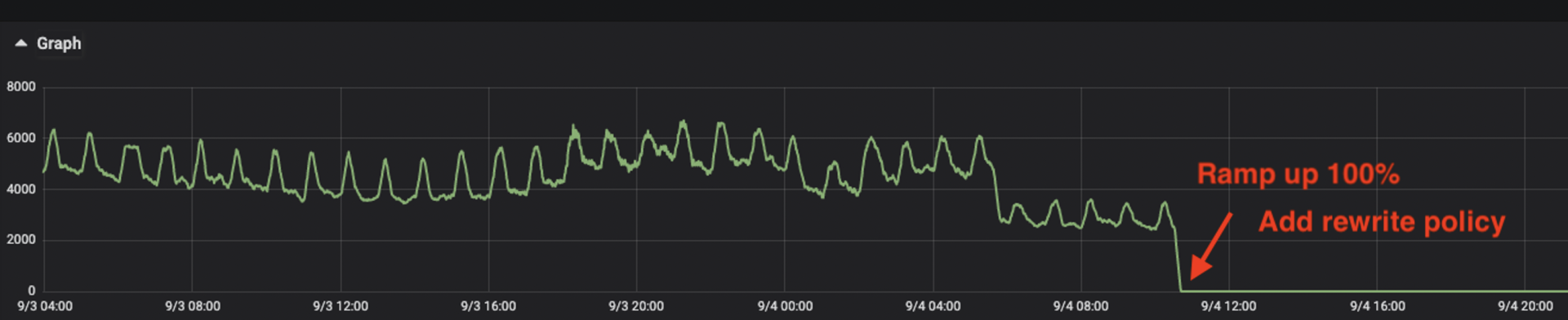为了解决这个问题,我们当然可以选择等待(比如几小时甚至几天)它自然收敛,但其实我们找到了更好的办法:在新老VIP上都添加了rewrite policy,使得每一定比例的HTTP响应里面,都带上Connection: Close这个头部。