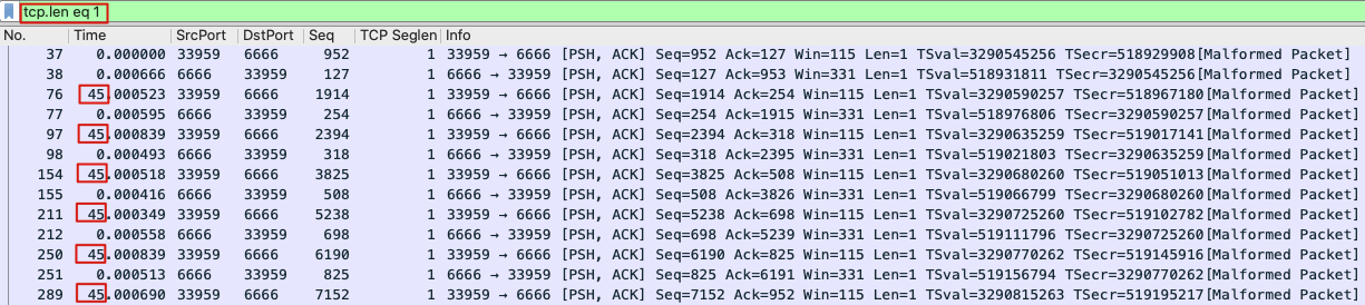 **这很反常,也是第二个很重要的发现。**要知道,这45秒的机制是在代码里实现的,照理说不可能出现13秒这么大的误差。现在,我们把 tcp.payload eq 01 这个条件去掉,回到这个TCP流的完整报文区域来综合分析: