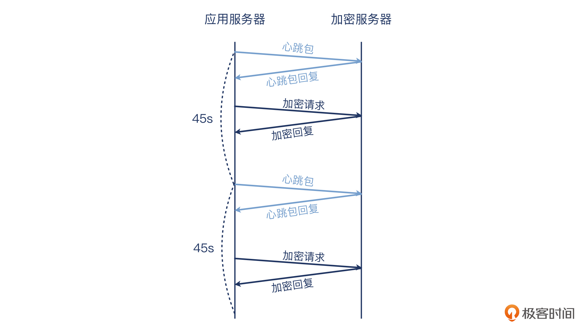 这个应用的架构比较简单:客户在云平台上部署了多台云主机,其中一台云主机专门做加解密,称之为加密服务器。另外几台云主机作为这台加密服务器的客户端,跟这台加密服务器保持TCP长连接。这些客户端会不时地跟加密服务器进行通信,完成加密操作。每45秒,客户端还会发送一次心跳包,这有两个作用:
