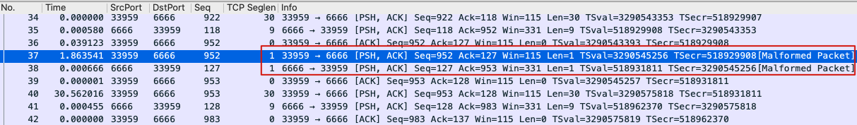 然后选了另外几个Malformed Packet,发现它们都是成对出现的。它们还有一个特征是: