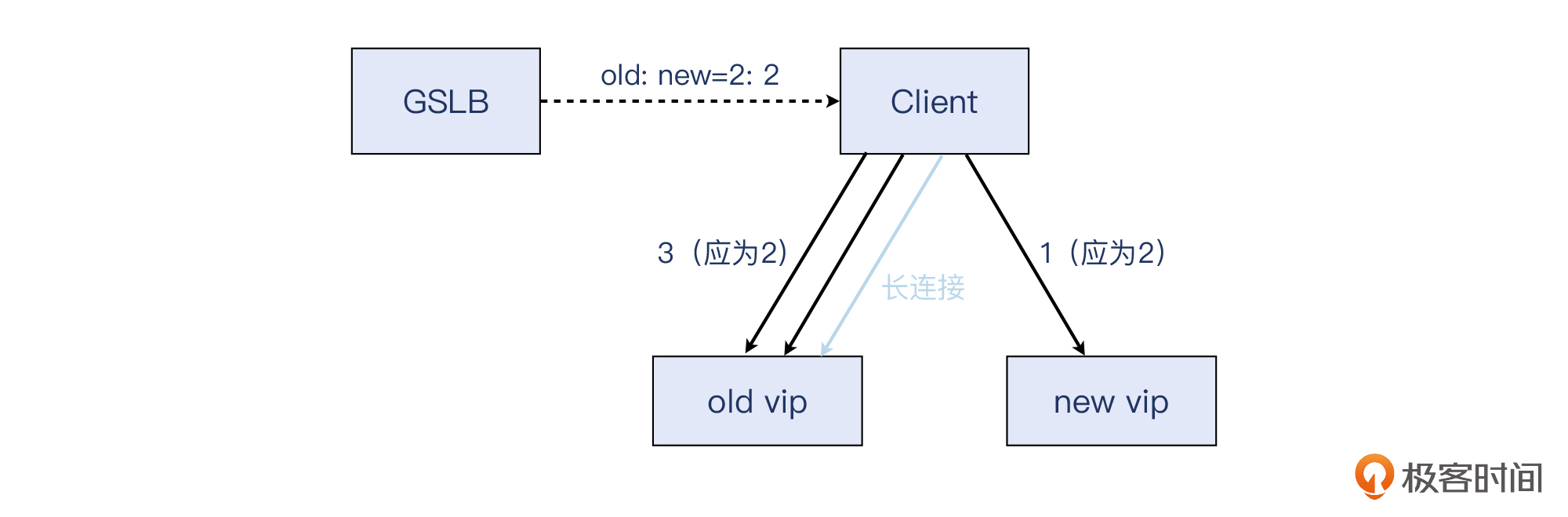 从上图中可以看到,客户端在查询GSLB(相当于智能DNS)的时候,拿到的新老IP的比例为2:2,那么访问量应该也是符合这个比例。但是因为长连接的存在,这些拥有长连接的客户端连问都不会去问GSLB,而是会继续往老的连接(也就是连着老VIP的连接)上发送流量,那么我们迁移流量的工作,就受到影响了。