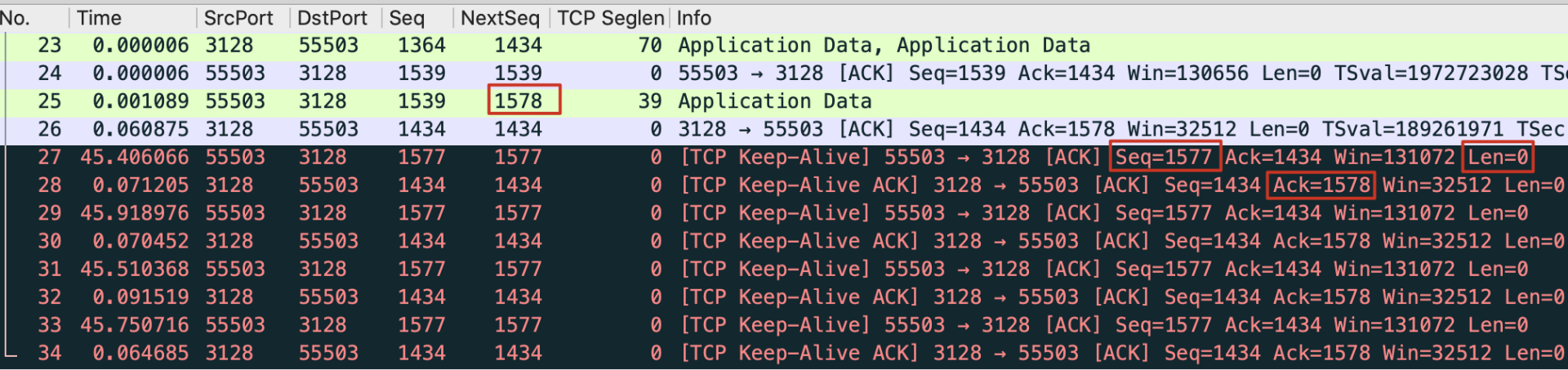 25号报文是离心跳包最近的一个常规报文,Wireshark告诉我们:它的下一个序列号(图中的NextSeq)是1578。也就是说,如果下一个是常规报文,那么这个常规报文的序列号就是1578。然后看同是这个客户端发出的报文27,这就是一个心跳包,它的序列号却是1577(也就是1578-1),载荷为0(Len=0)。对端对这个心跳包做了回应(包号28),确认号为1578(1577+1),载荷也为0。