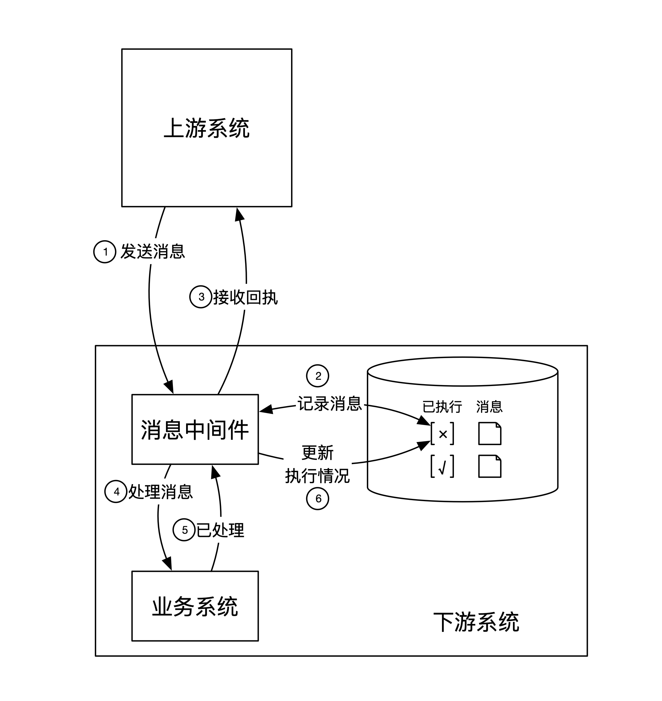 解决方法和上游系统类似,下游系统也会通过独立的消息中间件,实现和上游系统的正确交互。消息中间件在收到上游发过来的消息后先记录到数据库,然后再通知下游的业务系统处理。整个过程也同样分为6步: