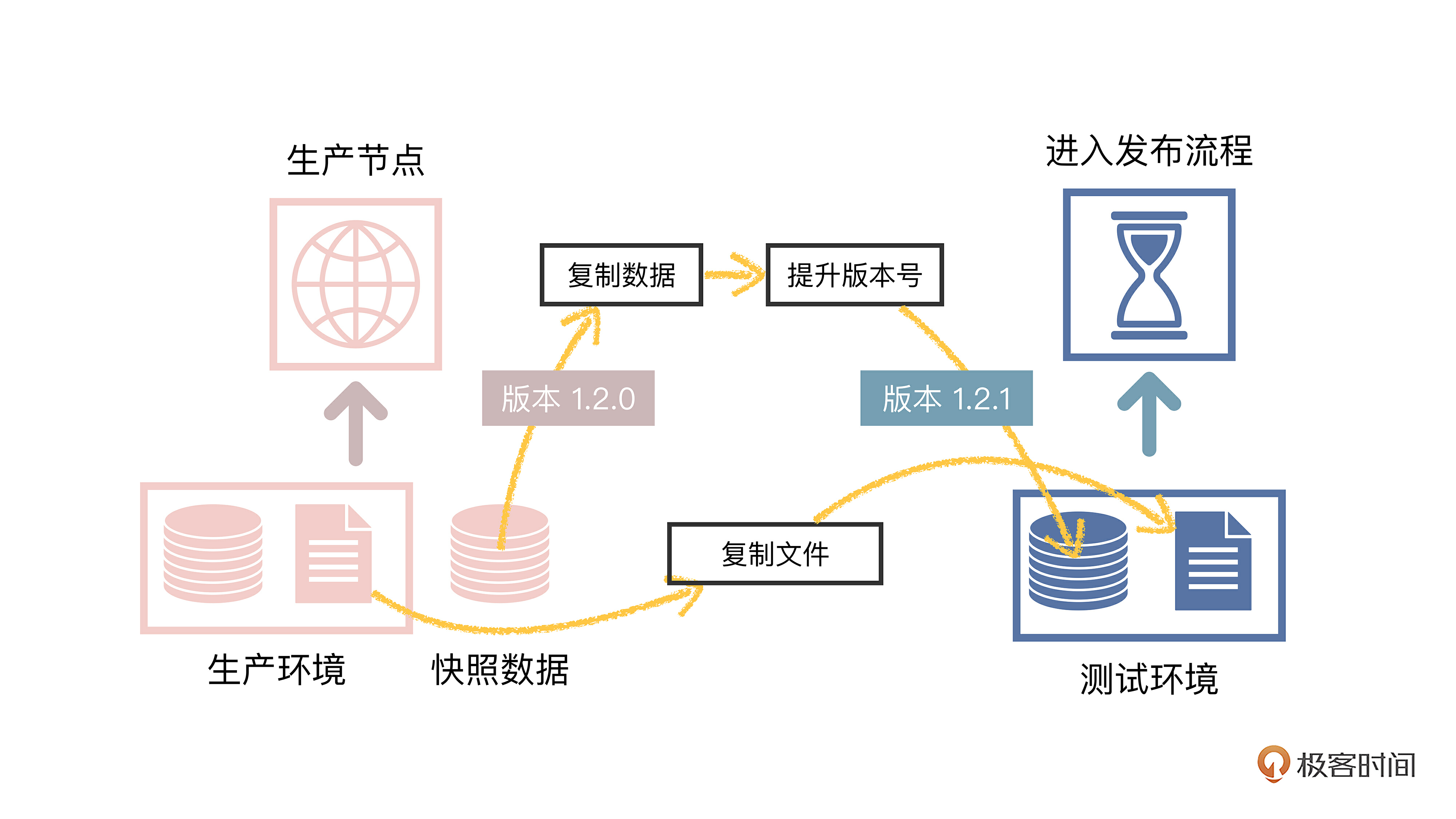 我画了一张具体的流程图,“数据”和“文件”重新投入到发布流程中,再次经过测试、预发和生产三个流程节点,把页面内容恢复到生产环境里。可以分成两步。