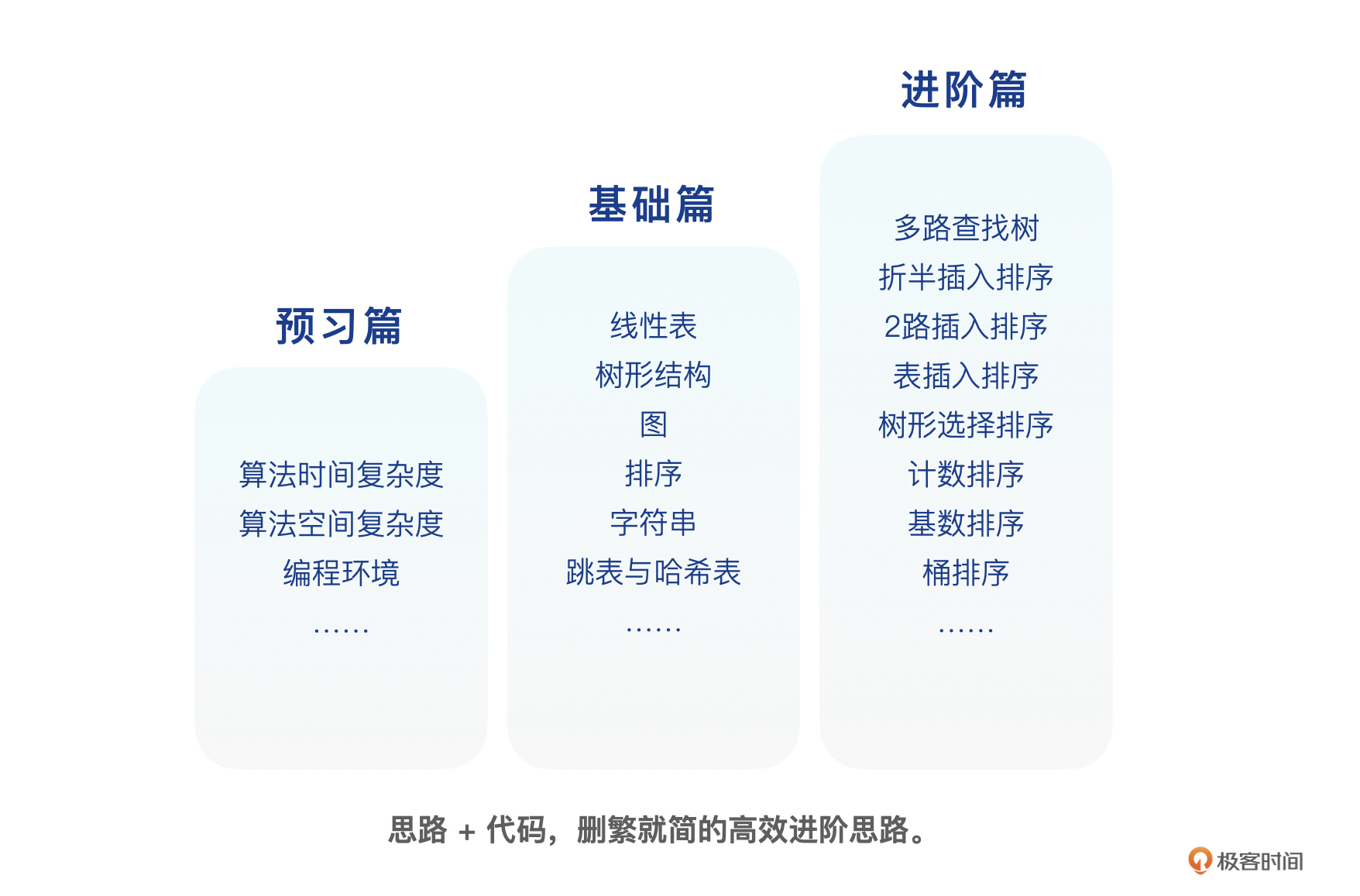 可以说,这门课给了你去LeetCode等网站刷题之前应该具备的各种理论和实践知识。我会先详细讲解一个数据结构或一个算法的概念和思路,在你充分理解后,再把这些思路通过代码的方式实现出来,整个过程会更简单、顺理成章。就好像我们讲一个故事,你自然是要先理清故事的脉络,再通过语言表达出来。这样,思路和语言实现,都不会再成为我们的绊脚石。