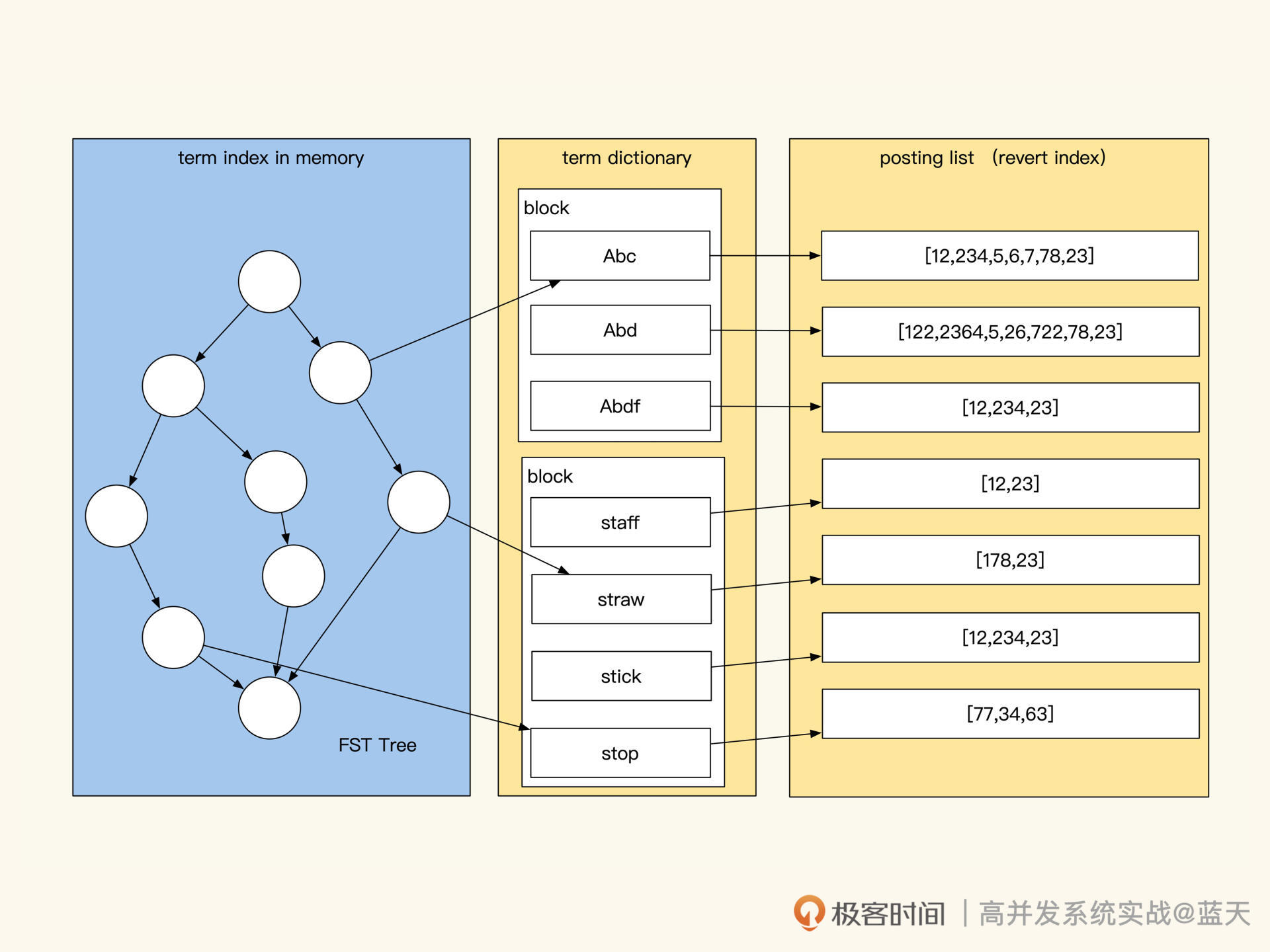 - Term Index(单词词典索引):用于关键词(Term)快速搜索,Term index是基础Trie树改进的FST(Finite State Transducer有限状态传感器,占用内存少)实现的二级索引。平时这个树会放在内存中,用于减少磁盘IO加快Term查找速度,检索时会通过FST快速找到Term Dictionary对应的词典文件block。