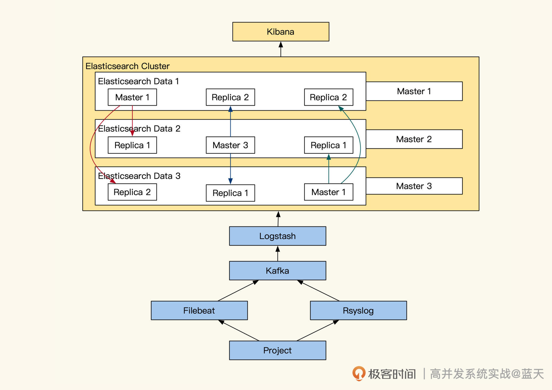接着,日志会被分词,然后计算出在文档的权重后放入索引中供查询检索,Elasticsearch会将这些信息推送到不同的分片。每个分片都会有多个副本,数据写入时,只有大部分副本写入成功了,主分片才会对索引进行落地(需要你回忆下分布式写一致知识)。