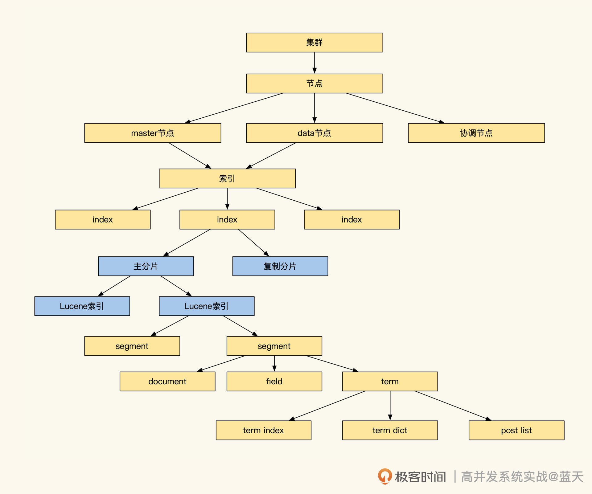 下图是Elasticsearch的索引存储具体的结构,看起来很庞大,但是别担心,我们只需要关注分片及索引部分即可: