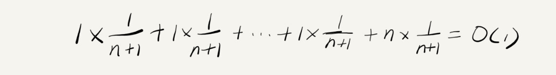 假设数组的长度是n,根据数据插入的位置的不同,我们可以分为n种情况,每种情况的时间复杂度是O(1)。除此之外,还有一种“额外”的情况,就是在数组没有空闲空间时插入一个数据,这个时候的时间复杂度是O(n)。而且,这n+1种情况发生的概率一样,都是1/(n+1)。所以,根据加权平均的计算方法,我们求得的平均时间复杂度就是:
