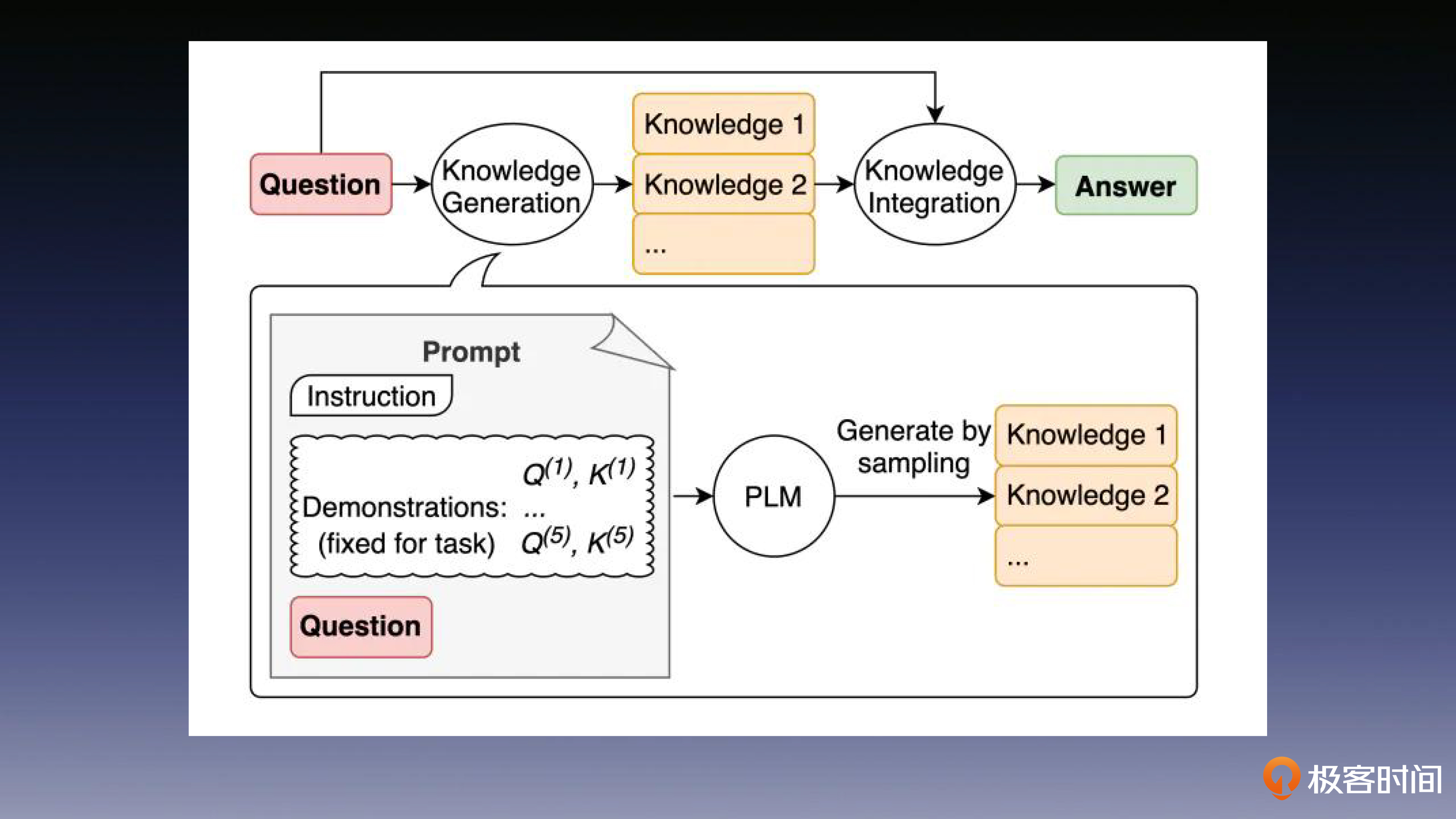 需要注意的是,这里的“记忆”是指模型在训练过程中获得的记忆,而不是提示词提供的外部记忆。这个方法的具体步骤是先让大语言模型生成一些,跟问题内容相关的“知识”,然后再把这个知识做为输入示例样本反哺给大语言模型,辅助回答目标问题。