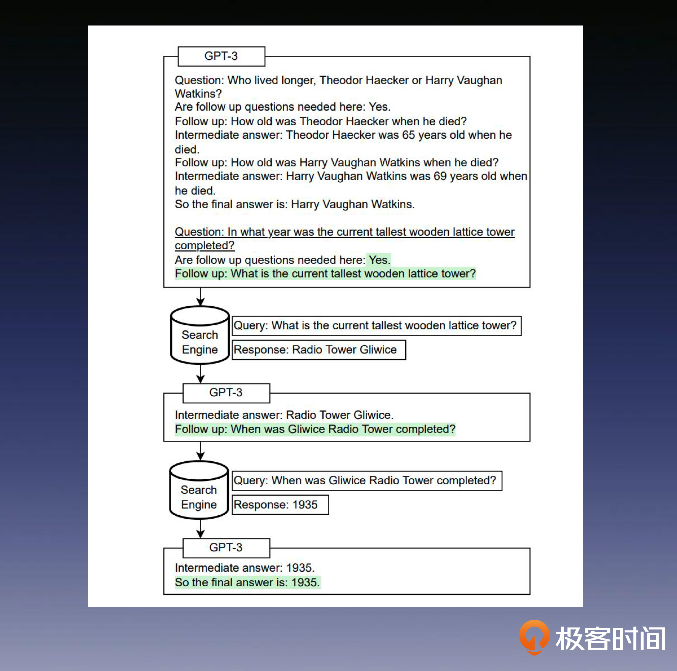 我们可以看到,在左边的图中,我们直接给大语言模型提出问题或者使用思维链的方式提示它回答问题,但都没有给出正确的答案。然而右侧的Self-Ask方法却给出了正确的结果,为什么会这样呢?下面我为你详细解释一下, Self-Ask 在这个过程中做了什么。