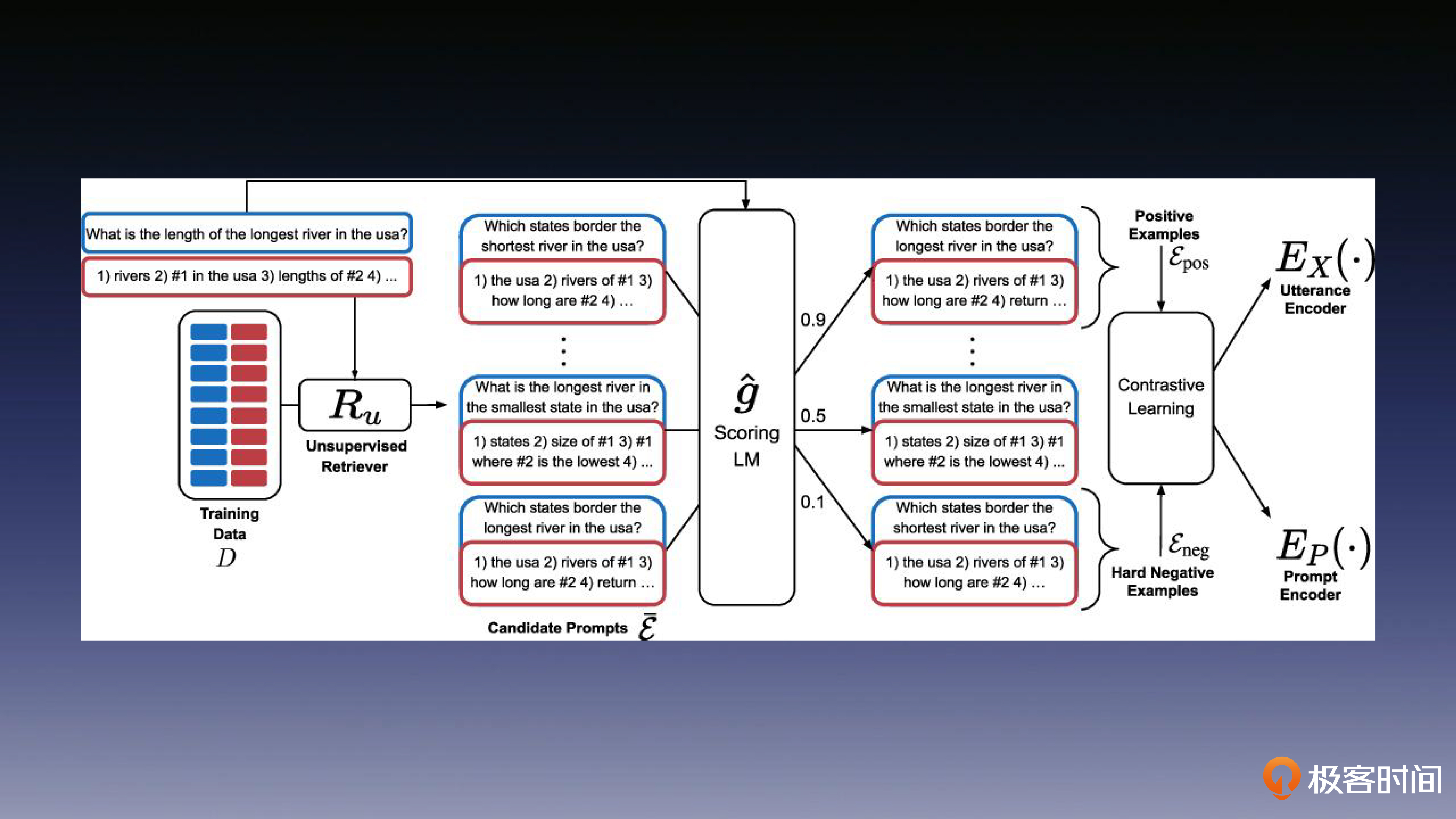 这个方法名叫 EPR,它借鉴了 Learning to Rank 中 Pairwise 的对比学习方法。相信你还记得我们在 GPT 系列课程里面学过这类方法。这类方法只需要给出优秀示例和劣质示例的对比关系,就可以训练出一个打分模型,用来评价示例样本的质量。