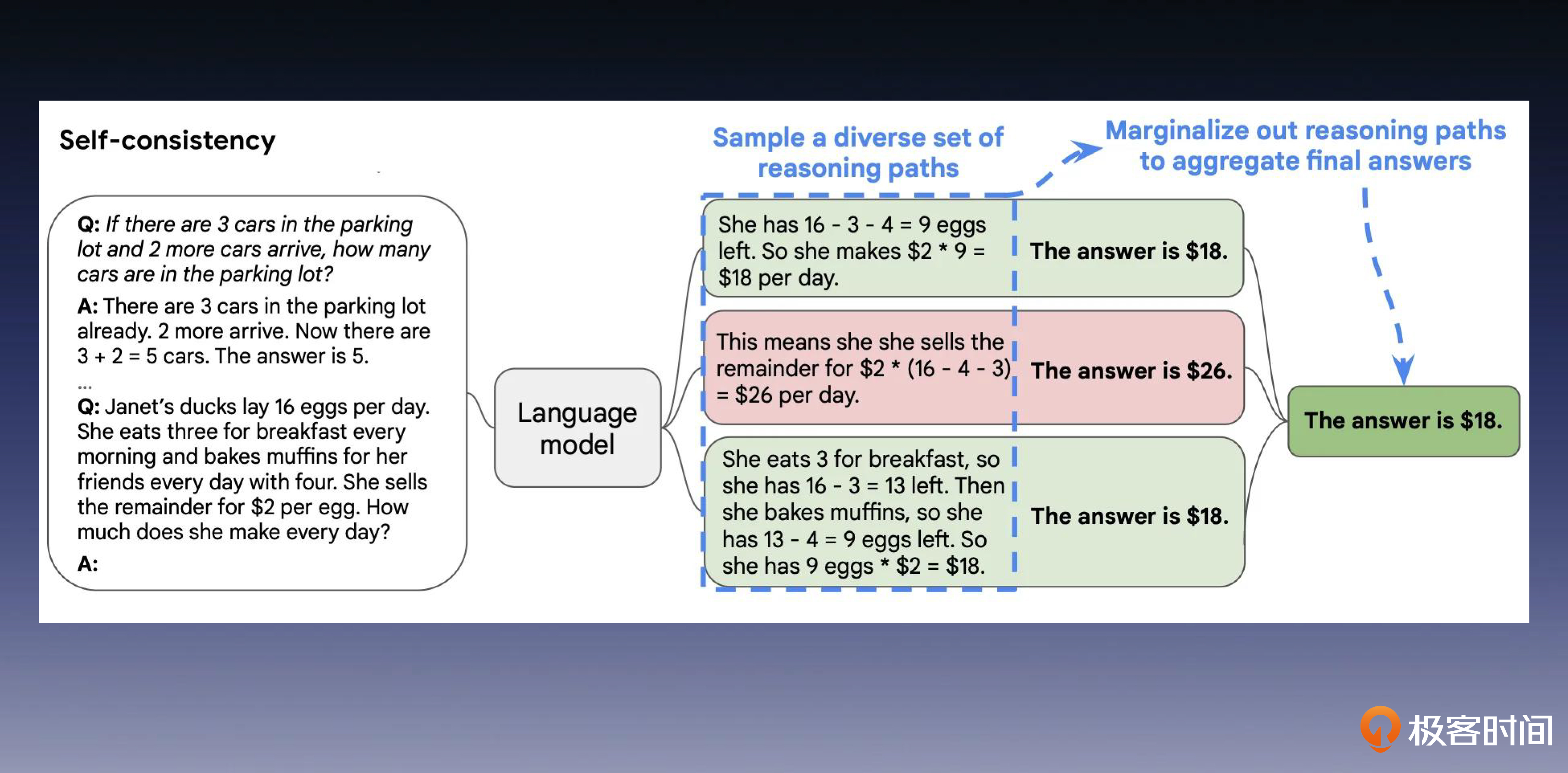 - 第三步, 在众多最终答案中,选择最一致的答案,作为最终的推理结果。
