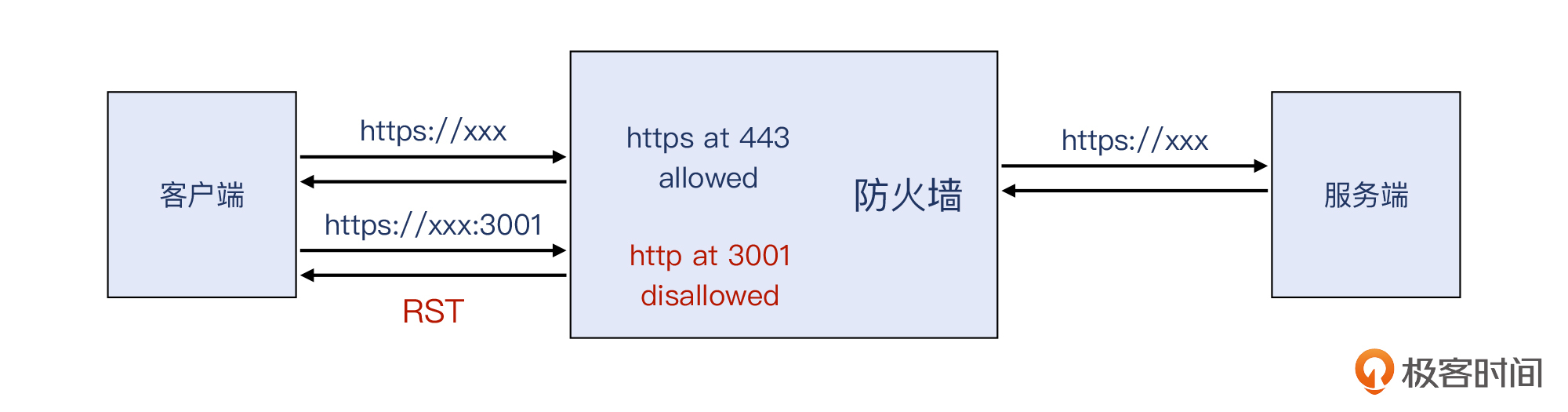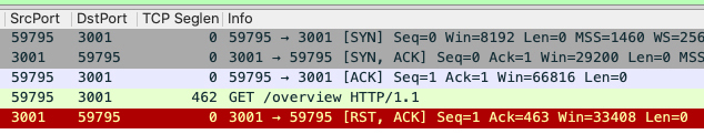 可见,TCP三次握手后,客户端发起了一个HTTP请求,即GET /overview HTTP/1.1,但服务端回复的是TCP RST,怪不得访问失败了。我画了下面这张示意图供你参考: