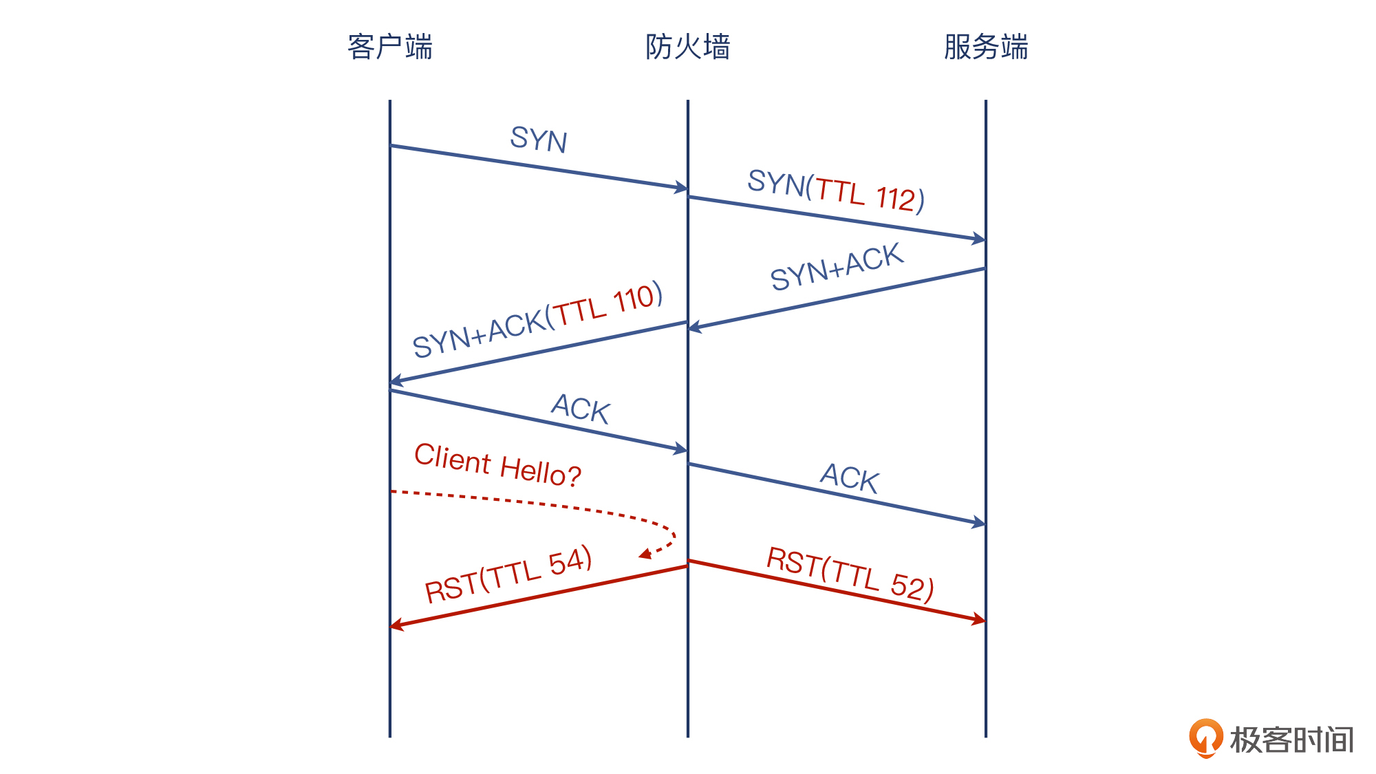 上节课我们采用的方法,是通过两端抓包后进行网络包的对比分析,排查定位到防火墙的存在,这种方法对于丢包、乱序等场景特别有用。而这节课的方法呢,是通过分析TTL值的变化,快速定位到防火墙的存在。这种方法,对于连接被重置(RST)的场景,十分有效。