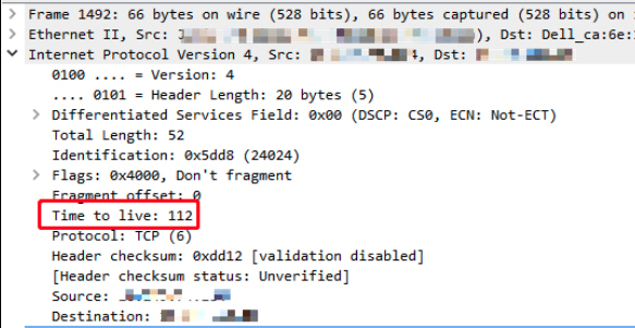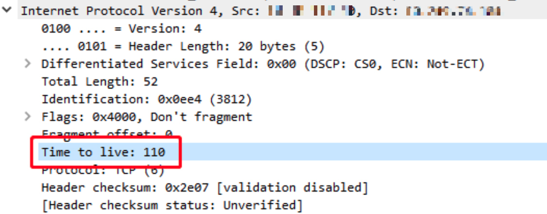 因为TTL是从出发后就开始递减的,那么必然,网络上我们能抓到的包,它的当前TTL一定比出发时的值要小。而且,我们可能也早就知道,TTL从初始值到当前值的差值,就是经过的三层设备的数量。