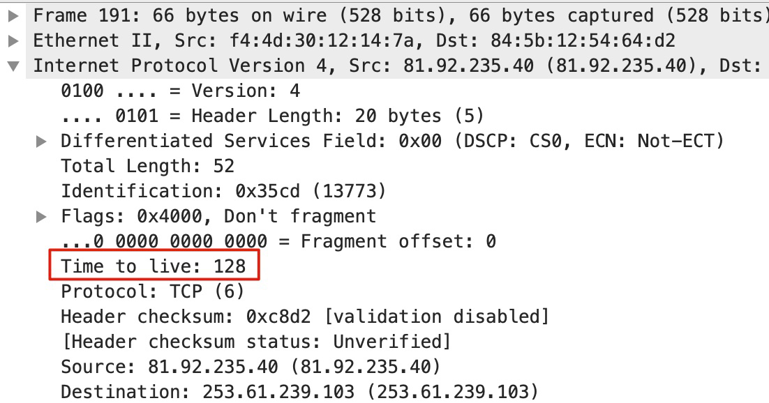 从服务端视角来看,它收到的报文只有三个:SYN包、ACK包、最后的RST包。我们选择SYN和RST,来对比看下它们的TTL是多少。下图是SYN包: