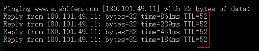 不同的操作系统其初始TTL值不同,一般来说Windows是128,Linux是64。由此,我们就可以做一些快速的判断了。比如我自己测试ping www.baidu.com,收到的TTL是52,如下图: