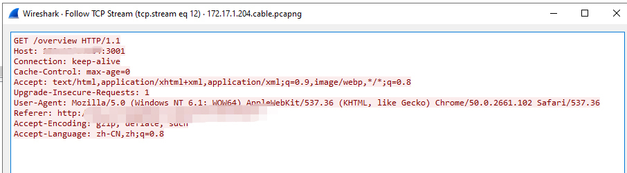 在我们点击TCP Stream的时候,Wireshark会弹出一个窗口,显示解读好的应用层信息。如果是HTTP明文(非HTTPS加密),那就可以直接看到里面的内容了。