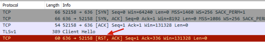 这是我们最近遇到的一个例子。eBay内部有一个用户报告,他的服务到LDAPS服务失败了(这个LDAPS在我们维护的Windows AD域控上),遇到了connection reset by peer的报错。LDAPS就是LDAP的TLS版本,它监听的端口是636。正好两端的操作权限我们都有,就可以做两侧抓包了。