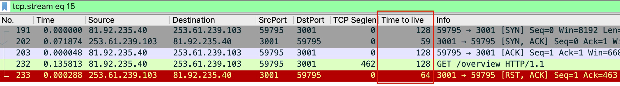 你也能很清楚地看到,同样的服务端,在三次握手中(SYN+ACK报文)的TTL是59,在导致连接中断的RST包里却变成了64!显然,**这个RST包并不是跟我们握手的那个服务端发出的,**否则TTL值就不会变化。