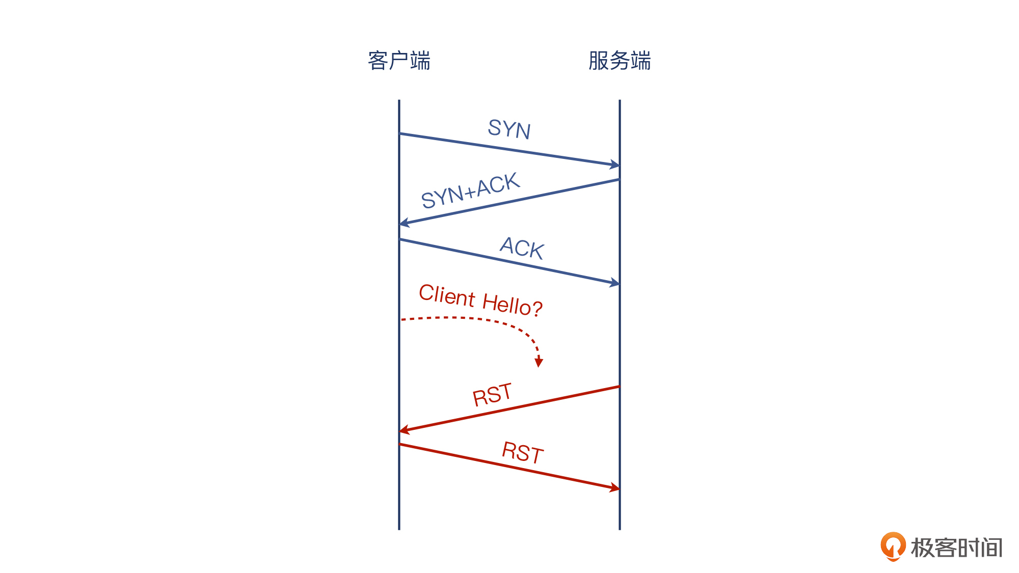- 服务端:收到了TCP握手 + 没有收到Client Hello。