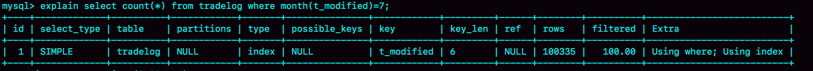 1 | mysql> select count(*) from tradelog where month(t_modified)=7; |