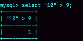 从图中可知,select “10” > 9返回的是1,所以你就能确认MySQL里的转换规则了:在MySQL中,字符串和数字做比较的话,是将字符串转换成数字。