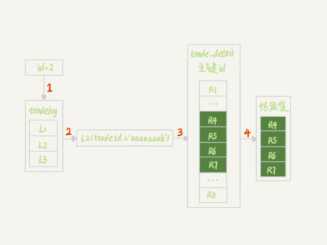 - 第1步,是根据id在tradelog表里找到L2这一行;