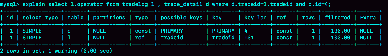 1 | mysql> select d.* from tradelog l, trade_detail d where d.tradeid=l.tradeid and l.id=2; /*语句Q1*/ |