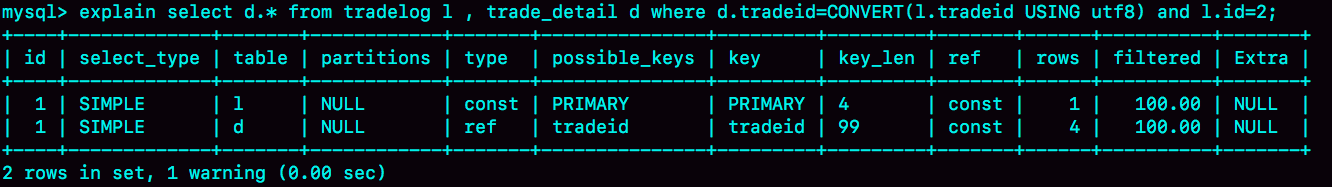 1 | mysql> select d.* from tradelog l , trade_detail d where d.tradeid=CONVERT(l.tradeid USING utf8) and l.id=2; |