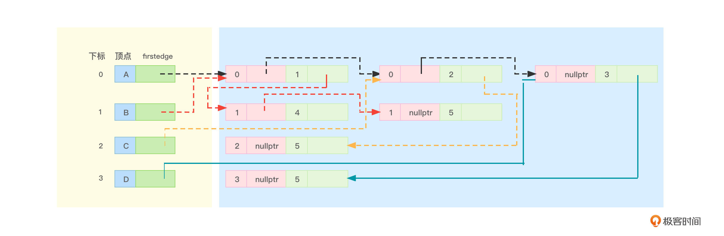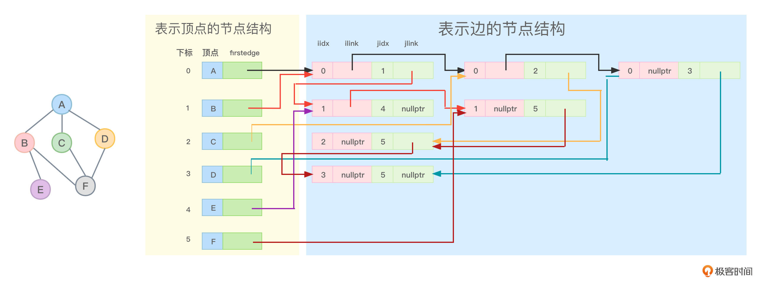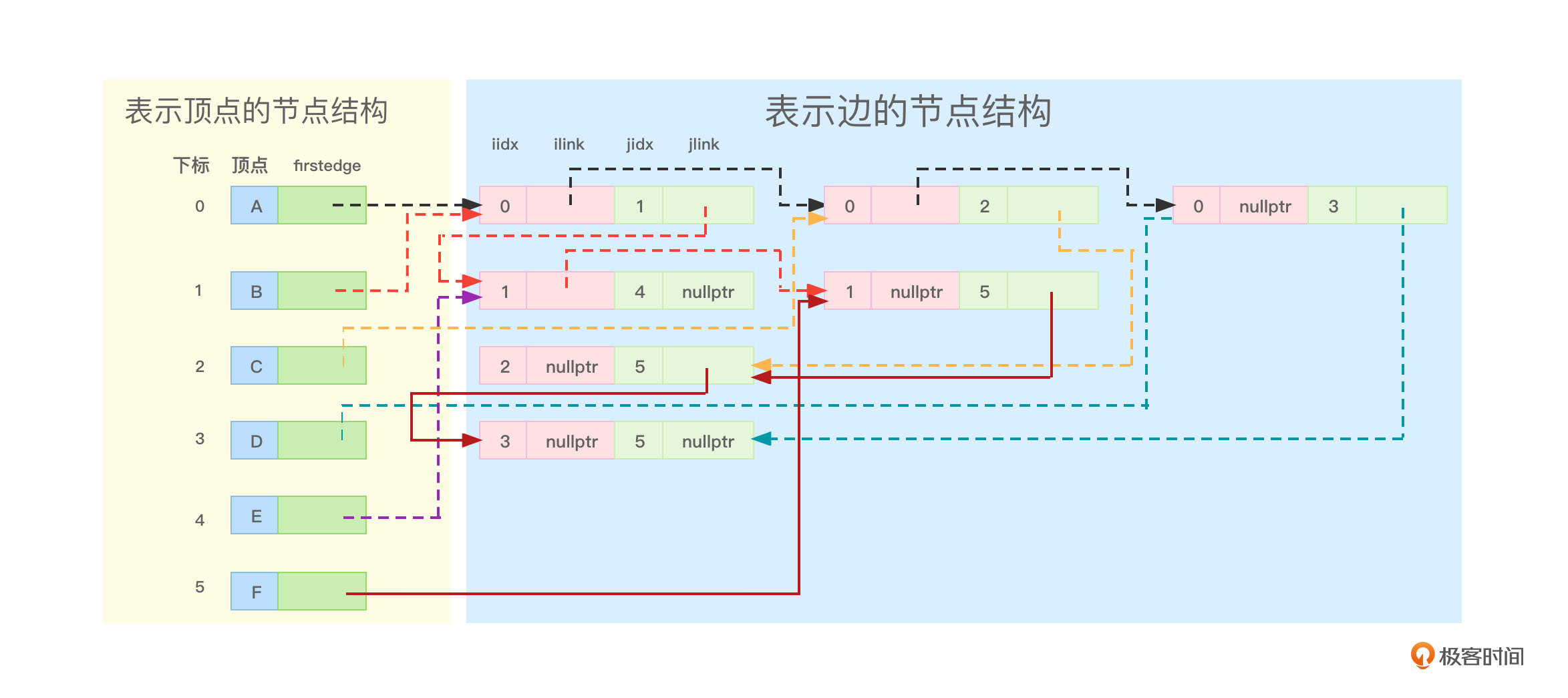 - “0、2”边节点的ilink指针就可以指向“0、3”边节点,顶点A没有其他相关边了,所以“0、3”边节点的ilink指针就应该指向nullptr。