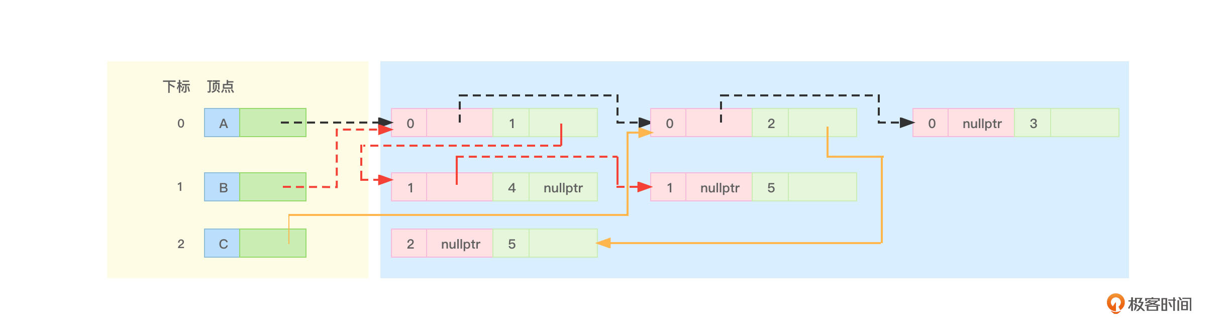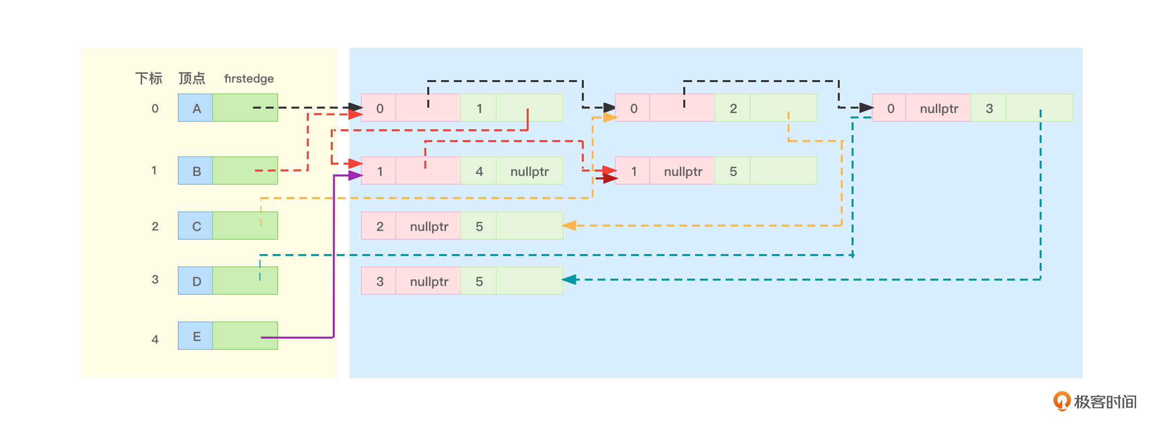 - “1、4”边节点的ilink指针就可以指向“1、5”边节点,顶点B没有其他相关边了,所以“1、5”边节点的ilink指针就应该指向nullptr。