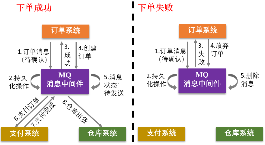 - 消息中间件返回消息持久化结果(成功/失败),订单系统根据返回结果判断如何进行业务操作。失败,放弃订单,结束(必要时向上层返回失败结果);成功,则创建订单。