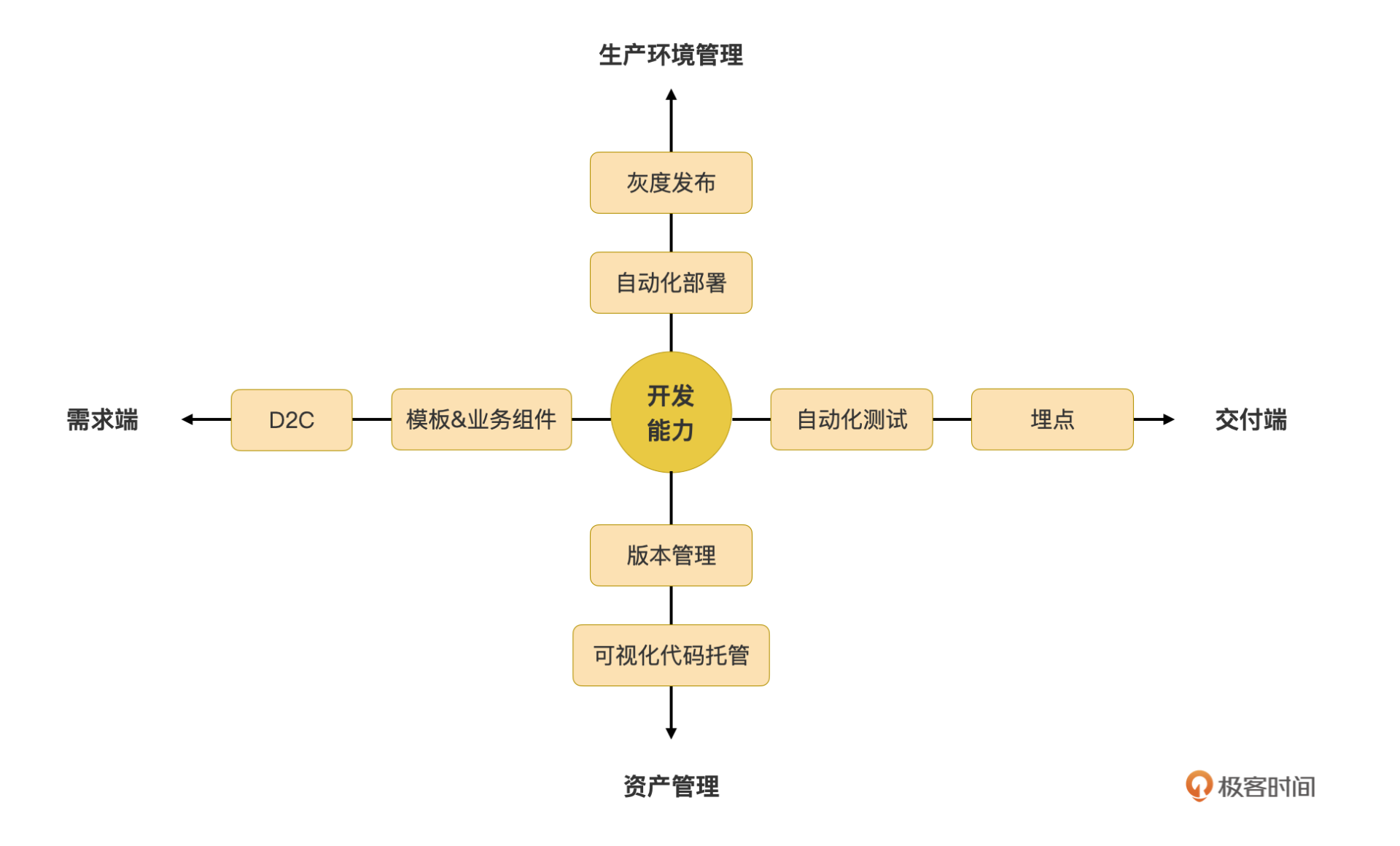 我们可以以App开发的生命周期为线索来寻找这些功能。以开发能力为中心,它的左侧为需求端功能,右侧为交付端的功能,上方为生产环境管理功能,下方为资产管理功能: