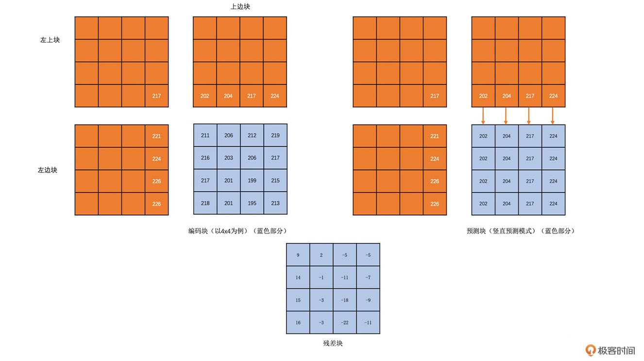 - 帧内预测:为了提高熵编码的压缩率,先将当前编码块的相邻块像素经过帧内预测算法得到帧内预测块,再用当前编码块减去帧内预测块得到残差块,从而去掉空间冗余。
