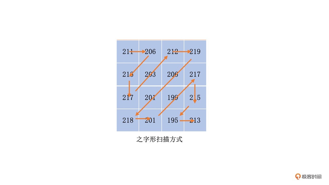 这样做完了DCT变换之后,低频和高频信息就分离开来了。由于低频信息在左上角,其余的都是高频信息。那么如果我们对变换块的像素值进行“之字形”扫描,这样得到的像素串,前面的就是数值比较大的低频系数,后面就是数值比较小的高频部分。