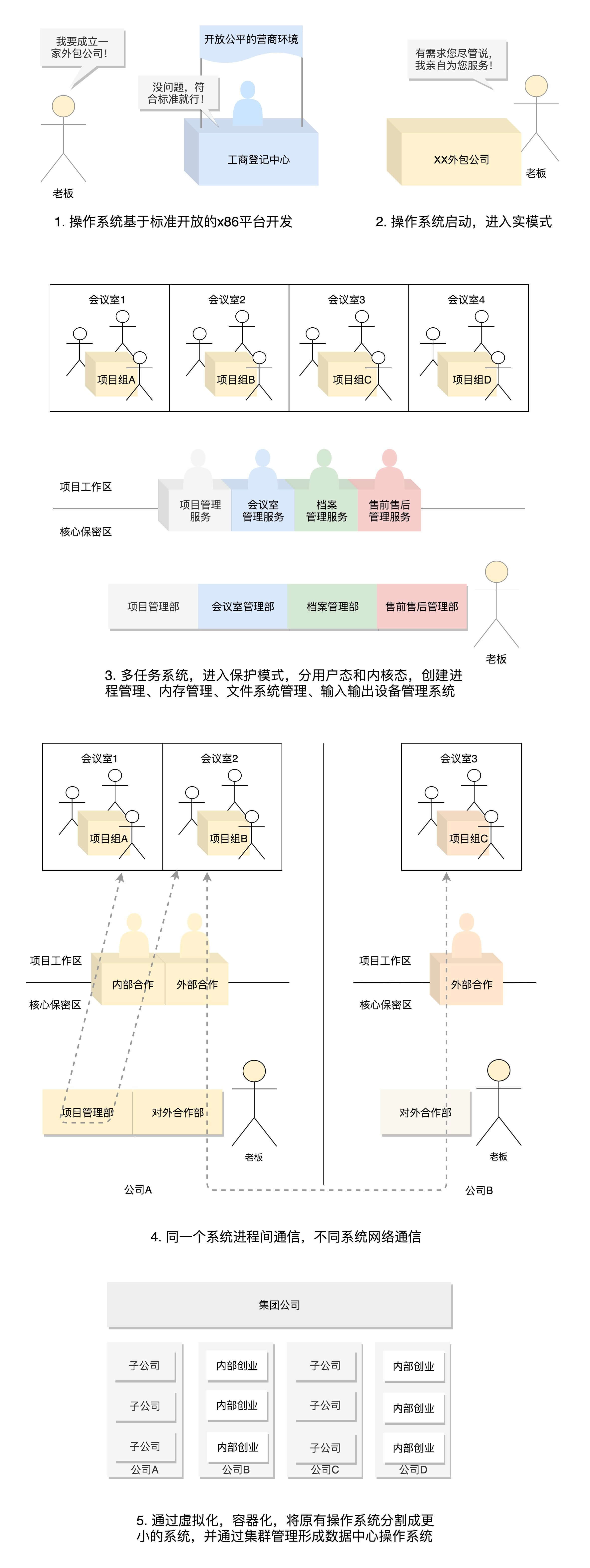 假设,我们现在就是在做一家外包公司,我们的目标是把这家公司做上市。其中,操作系统就是这家外包公司的老板。我们把这家公司的发展阶段分为这样几个时期: