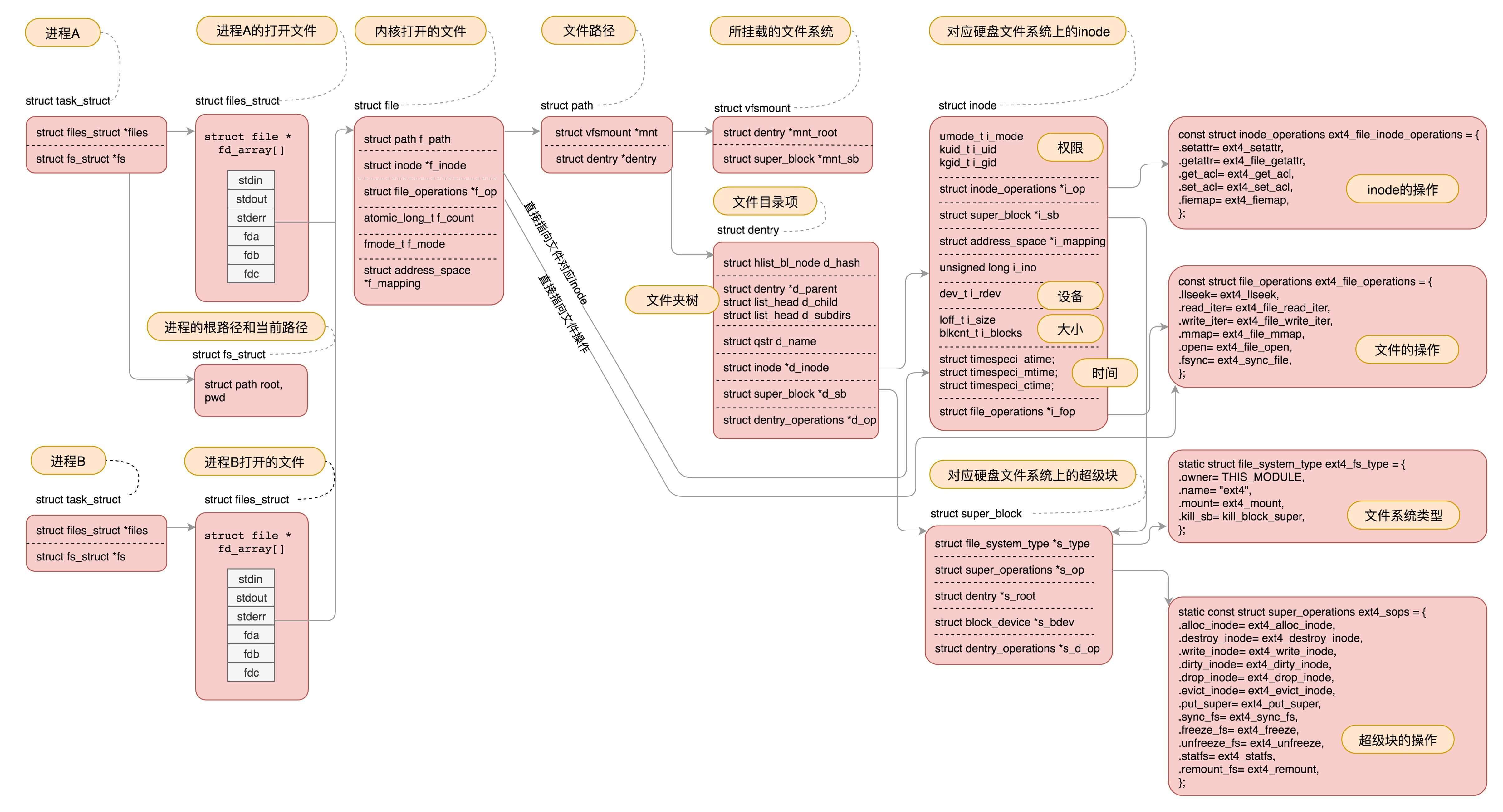 例如,这张图就表示了文件操作在各个层的数据结构的关联。只要你学完之后,能对着这张图将它们之间的关系讲清楚,对于文件系统的部分,你就会了然于心了。