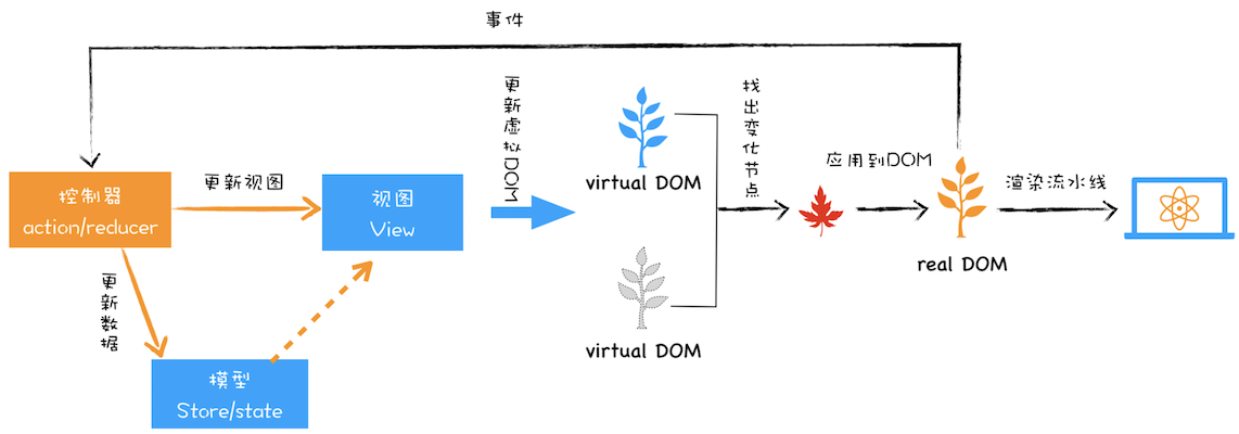 在该图中,我们可以把虚拟DOM看成是MVC的视图部分,其控制器和模型都是由Redux提供的。其具体实现过程如下: