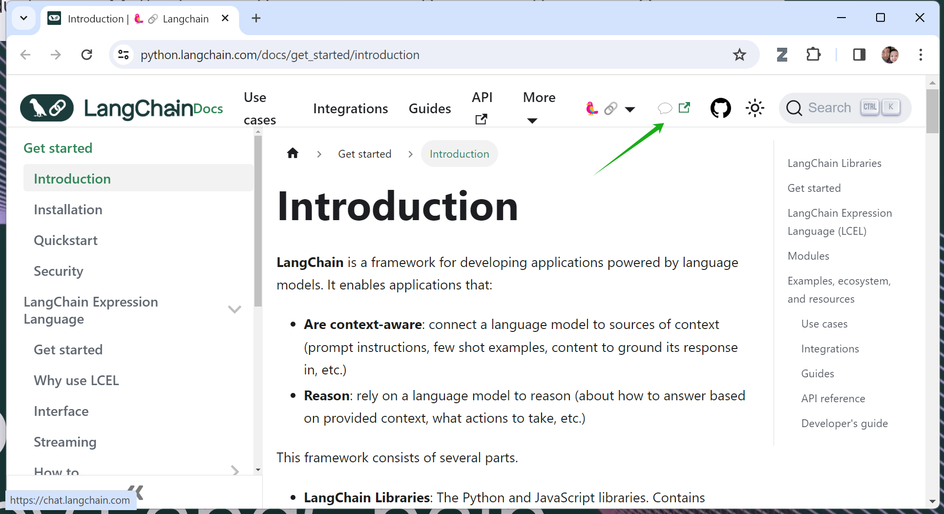 作为一个与各种企业紧密互动的技术人员,我的日常感受也与上面这份商业报告相符,不仅仅是公司内部、外部,都纷纷展开基于大模型的智能文档管理/检索系统。就拿我经常访问的LangChain网站来说,我就发现基于大语言模型的应用程序早已渗透到了网站功能设计之中,比如下面两张图的绿箭头处,所显示的文档检索功能,都是基于大语言模型所开发的。而OpenAI去年11月推出的ChatGPT企业版,已经被很多很多家财富五百强企业所采用,为企业降本,为员工增效。